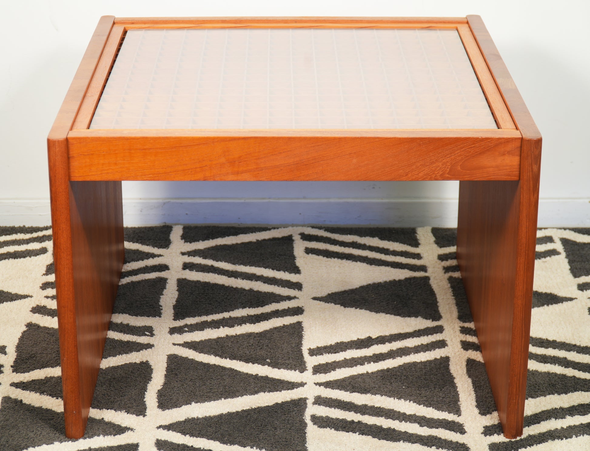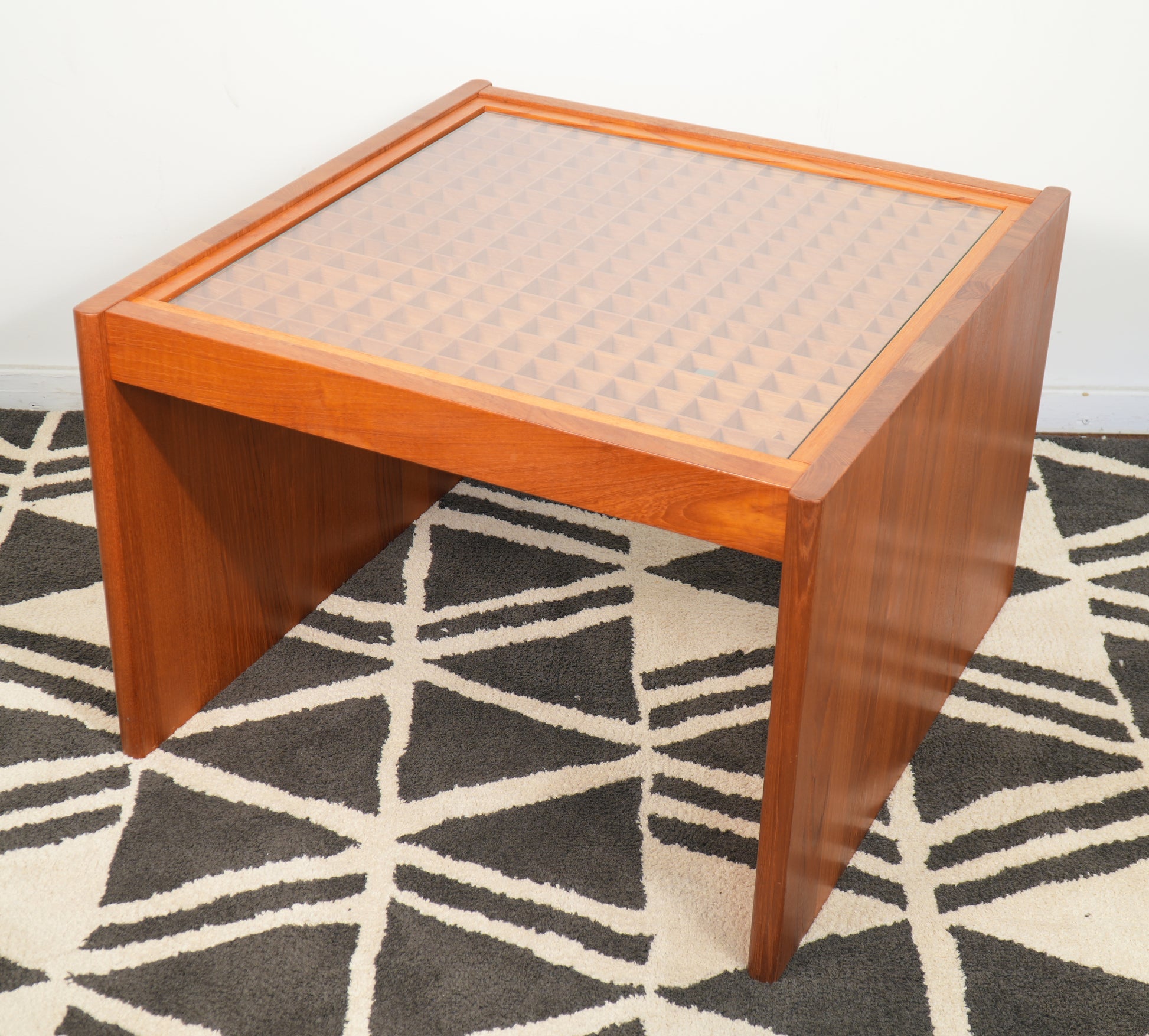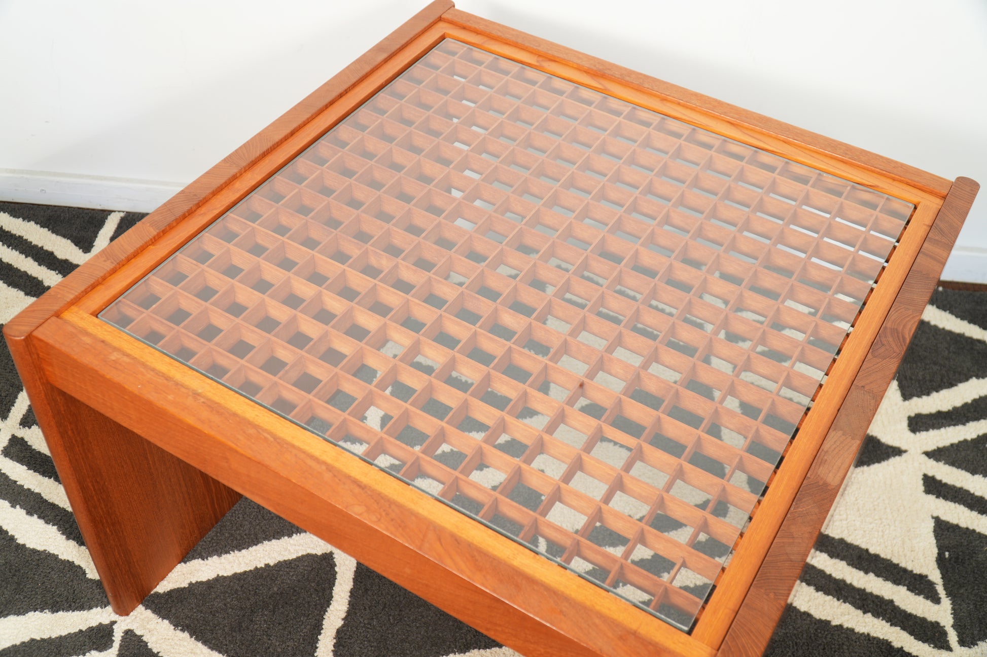 Danish solid teak geometric coffee table by Komfort. A glass insert forms the tabletop while showcasing the teak grid below. All solid teak pieces are in very good vintage condition. There are two small chips in the teak grid. Please see all images for complete condition information.
