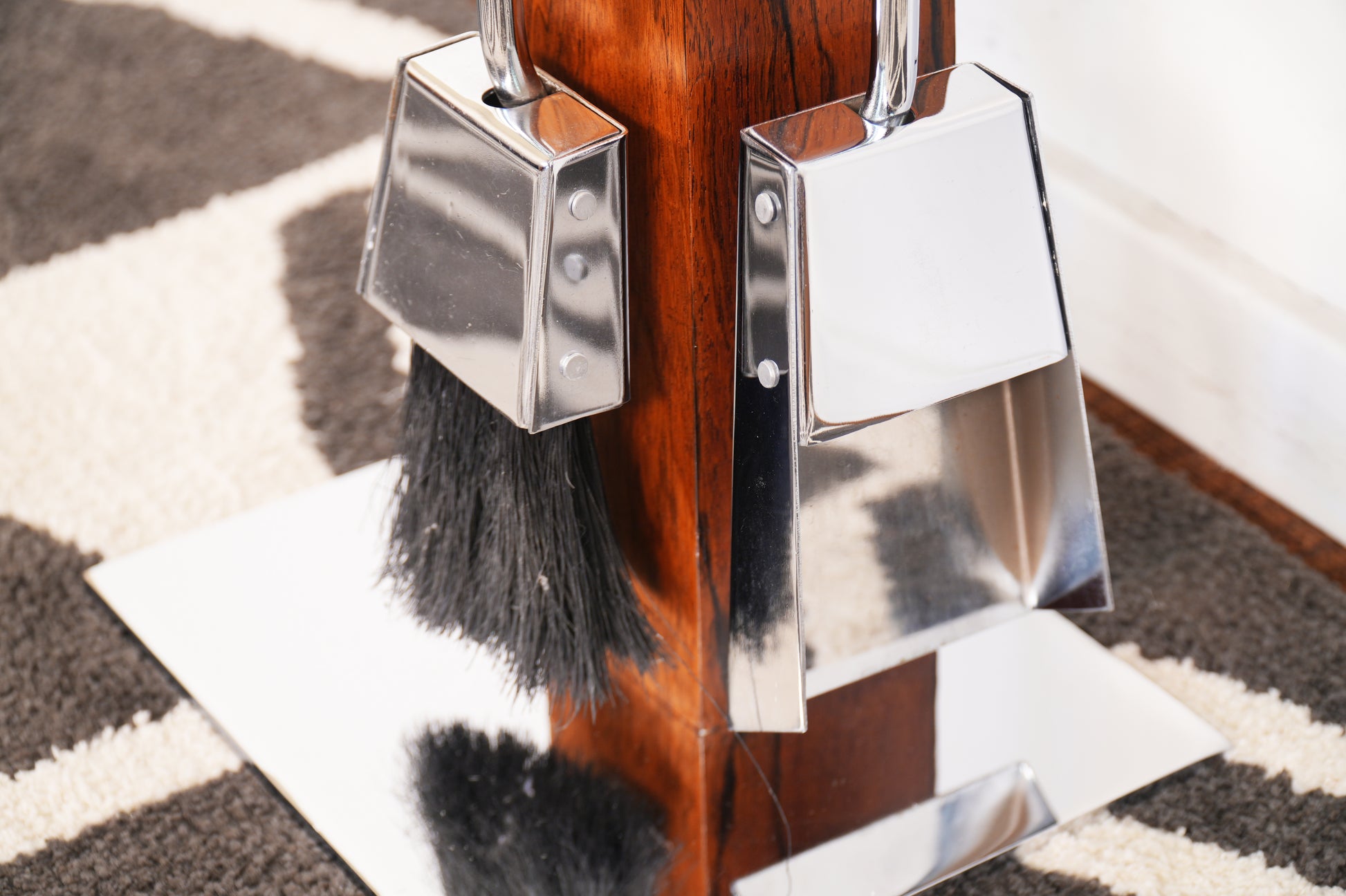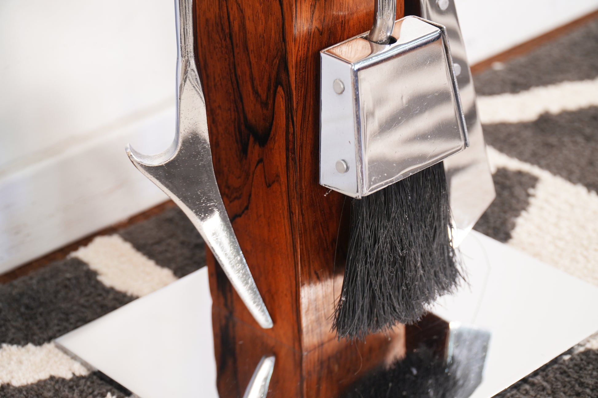 This Italian-made Alessandro Albrizzi fireplace toolset perfectly combines form and function. Both the base and tools feature rosewood and chrome construction. The set includes a poker, brush, and shovel on chrome hangers and mounted on the rosewood base. It has had minimal use and is in excellent condition, a perfect addition to your hearth.