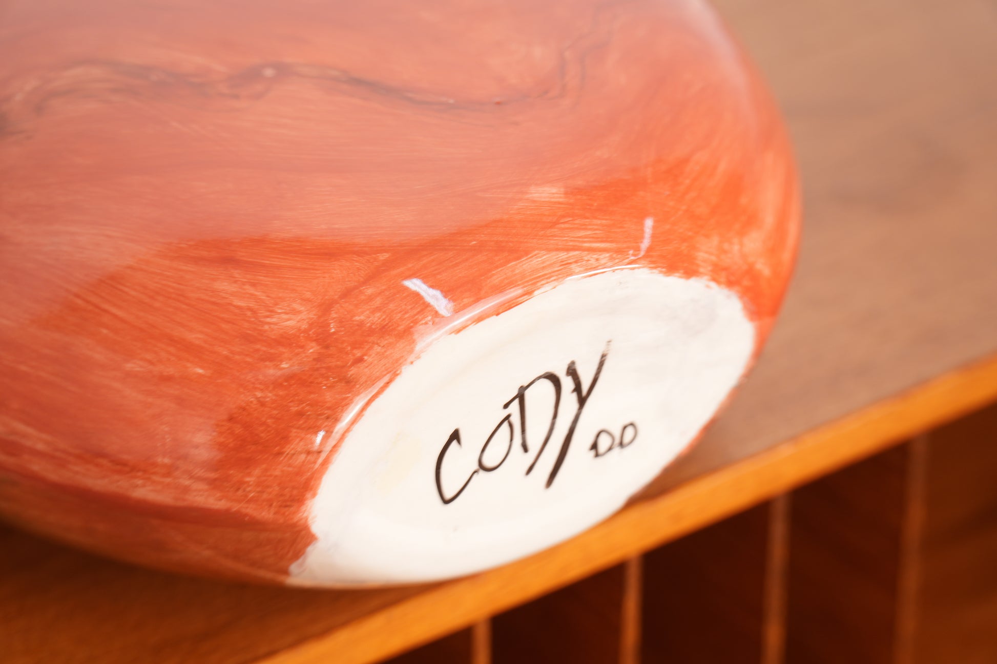 Colorful and whimsical, this ceramic hand-painted art vase by Terri Cody is signed by the artist and measures 10 1/2" H x 9 1/2" W x 4 1/2" W. It is in excellent condition with no chips, cracks, crazing or color loss. Please view all images for complete condition information and inquire with any questions.