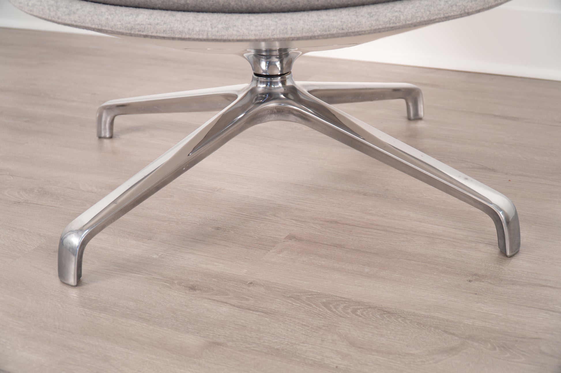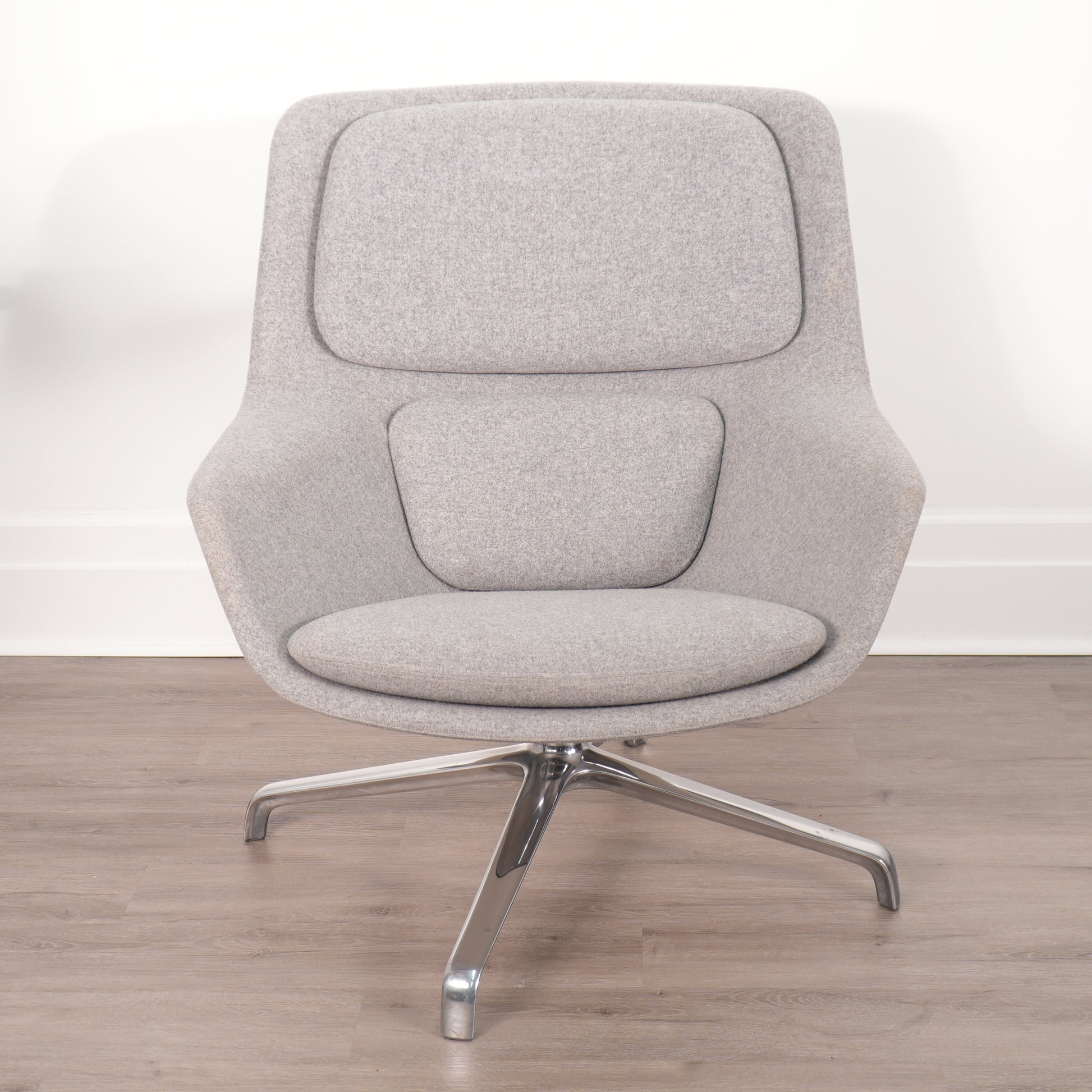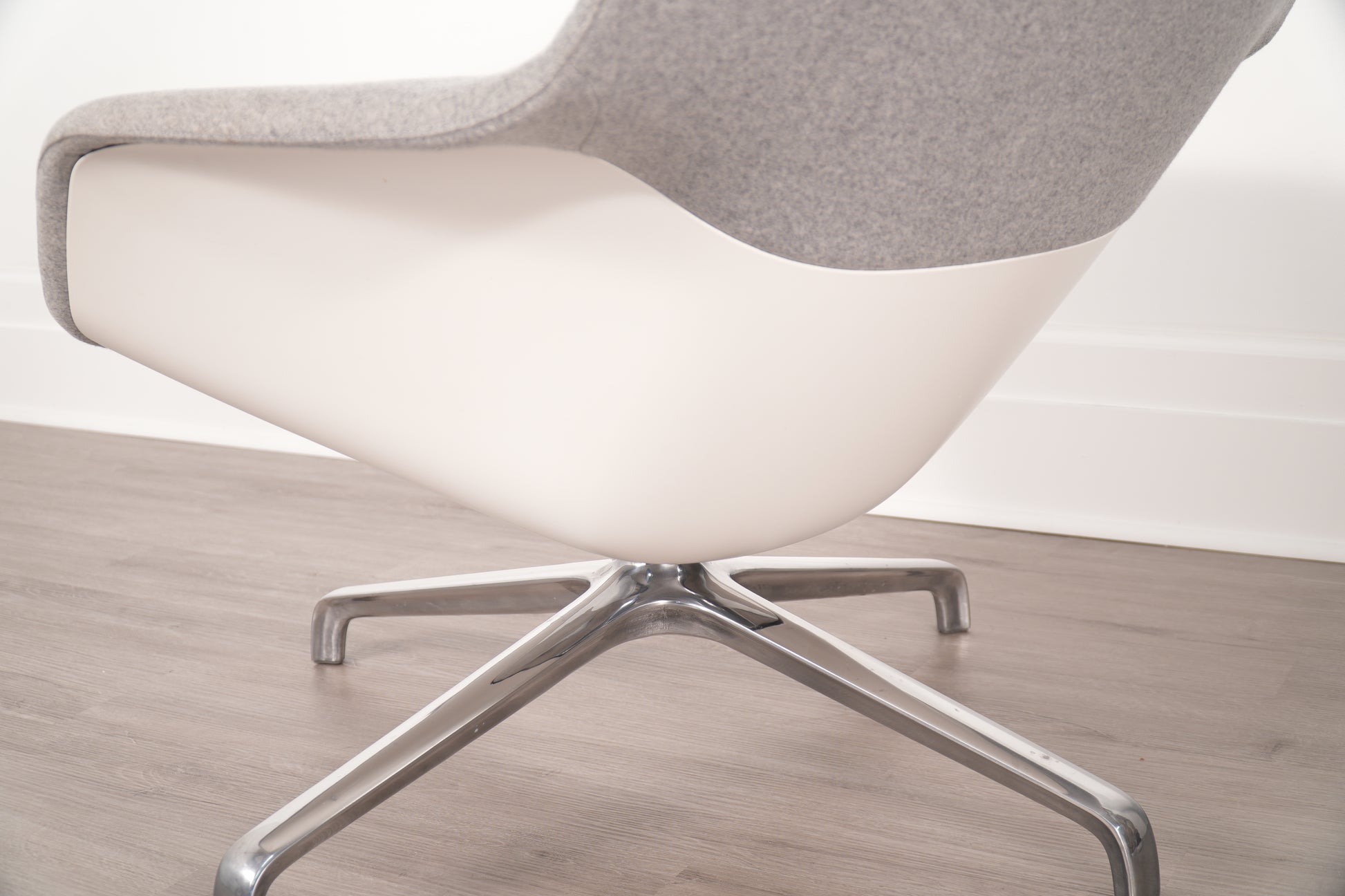 This chair: This is a Herman Miller Striad mid-back lounge chair with Cozy worsted wool coverings in Heathered Warm Gray, a four-star auto-return base and white shell. It was purchased in 2020 and is in overall very good condition with the shell and star base in excellent condition and the worsted wool upholstery in very good condition with some light staining. Please view all photos for complete condition and inquire with any questions.