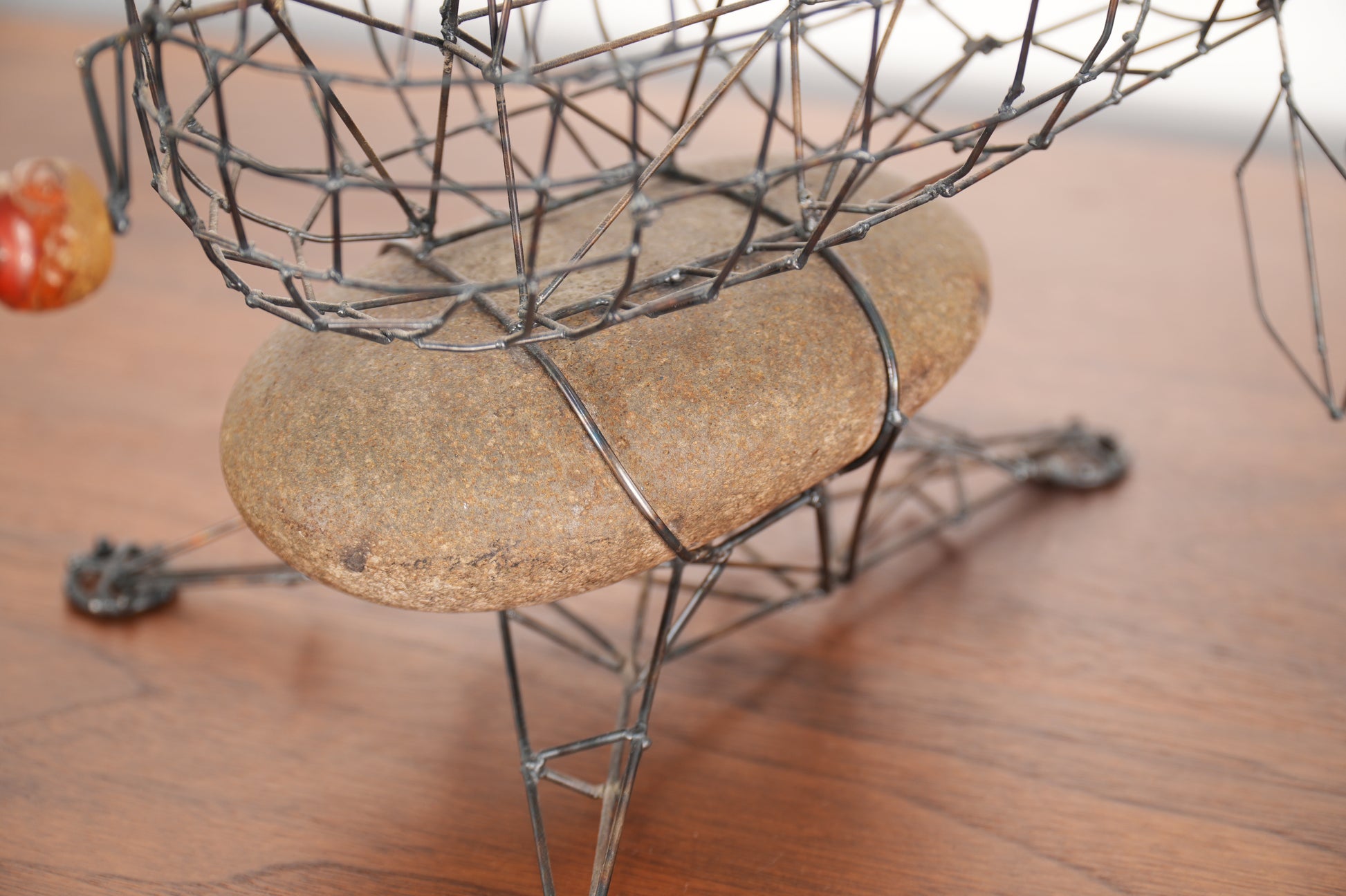 This is a metal, beads and stone 1970s kinetic sculpture by artist Joe Police. When the crank is turned the wings flap and the tail feathers ruffle. Beautifully and intricately designed, this whimsical piece's base is anchored by a smooth river stone. In excellent condition and working order with no perceptible wear or breaks in welds. Please view all photos and inquire with any questions.