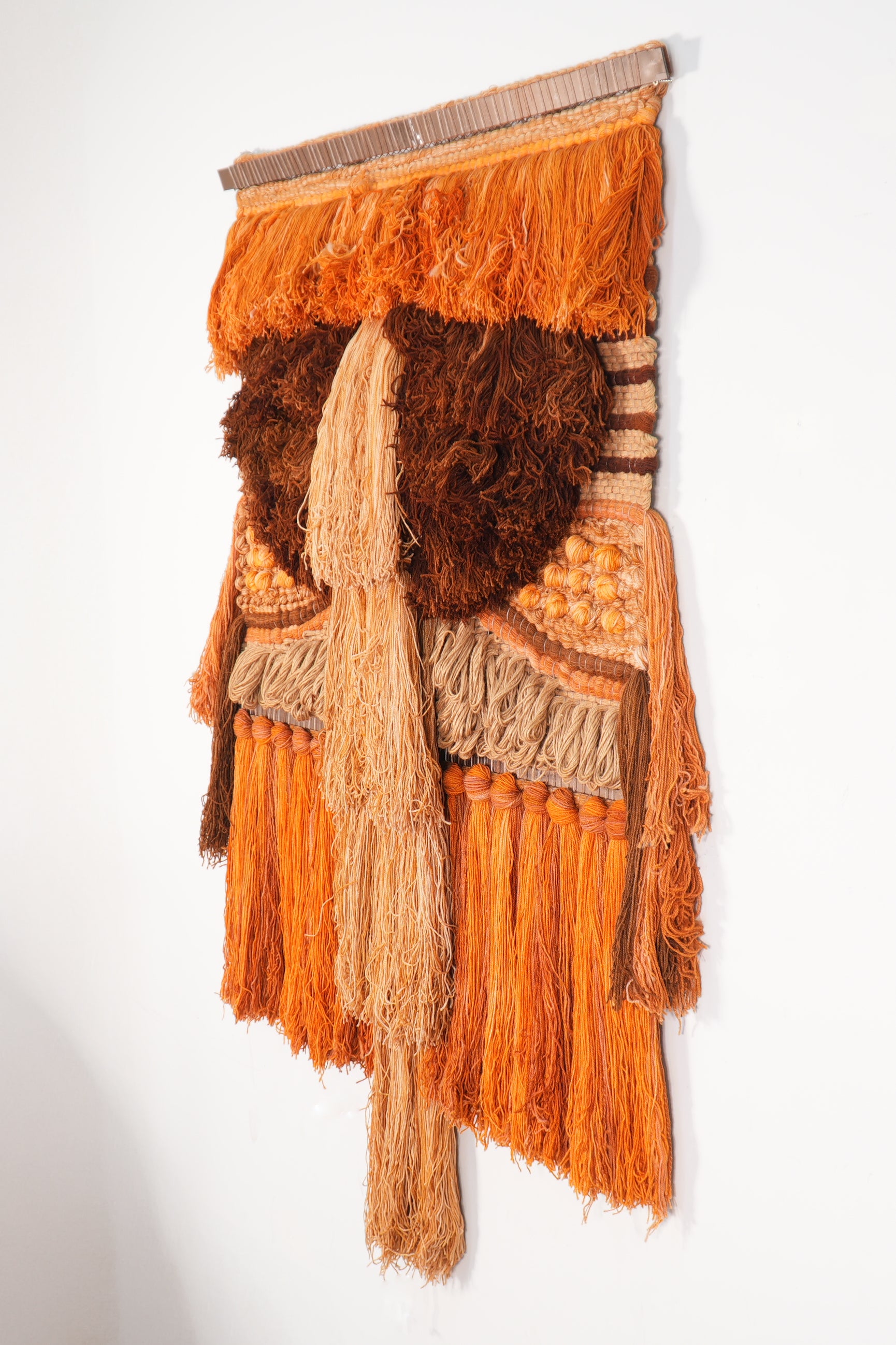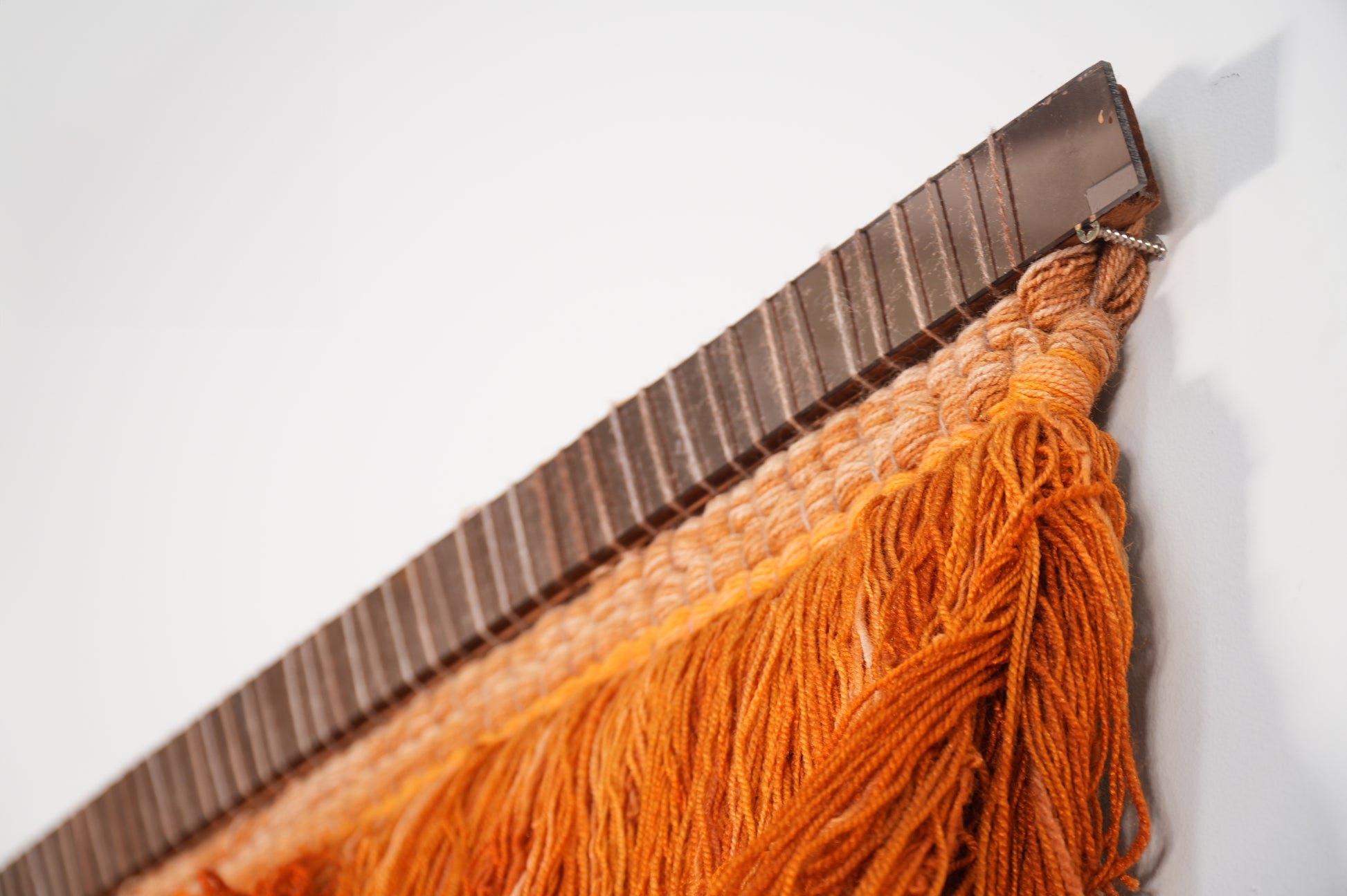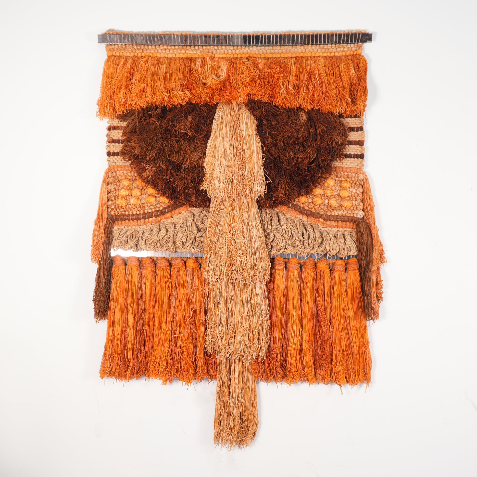This is a striking mid-century modern textile piece crafted by Margo Farrin O’Connor in California in the 1970s and created for Ted Morris & Associates. This handwoven, hand-tied, & hand-dyed fiber tapestry features wool and jute in a rich palette of orange, brown, beige, rust, and ivory, characteristic of O’Connor’s monumental creations. 2-inch mirrored strips are incorporated into the piece's top and middle, extending from side to side and covering the wood battens. In very good original condition. Please see all images for complete condition information. Unsigned but distinctive work.