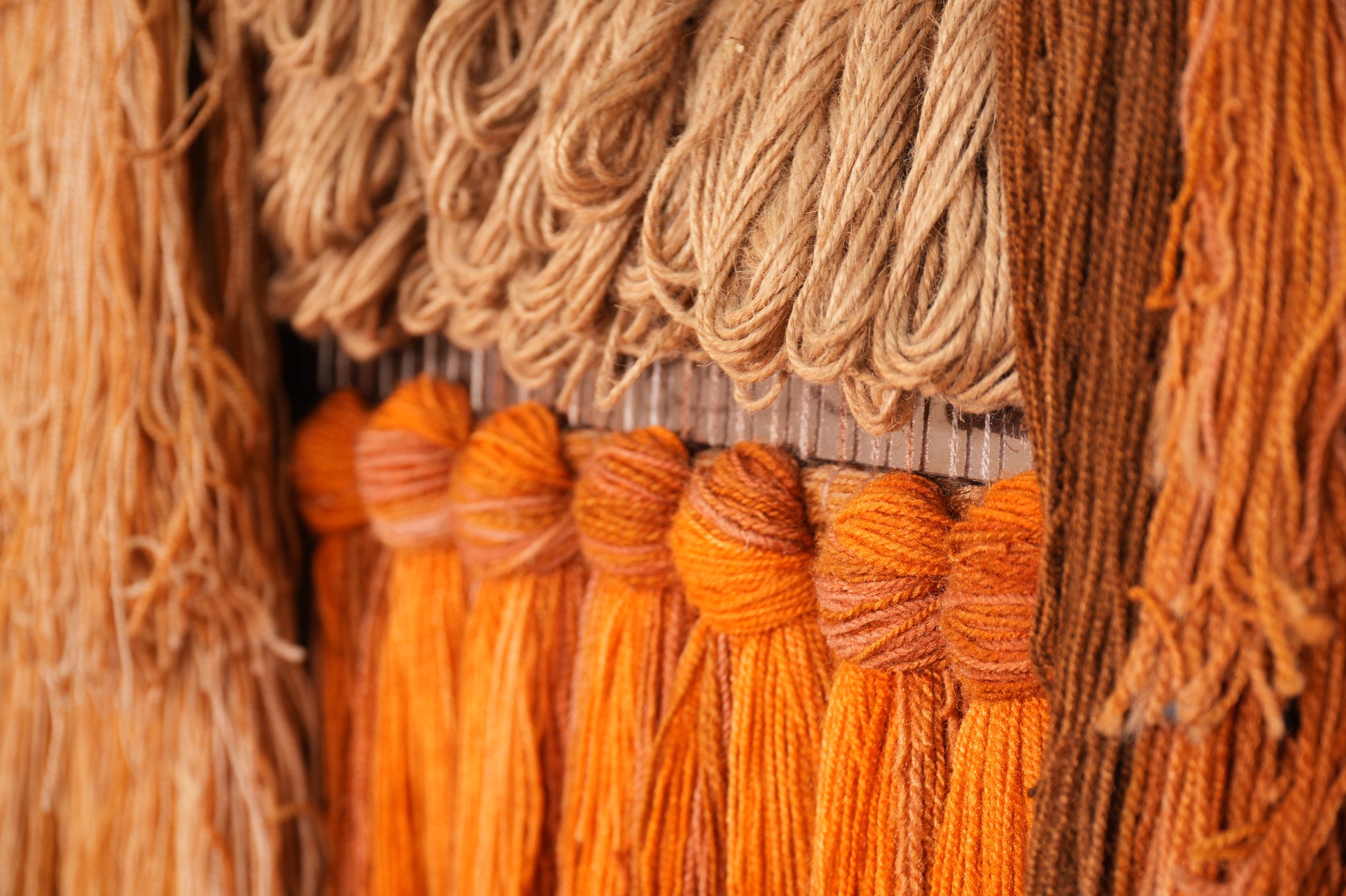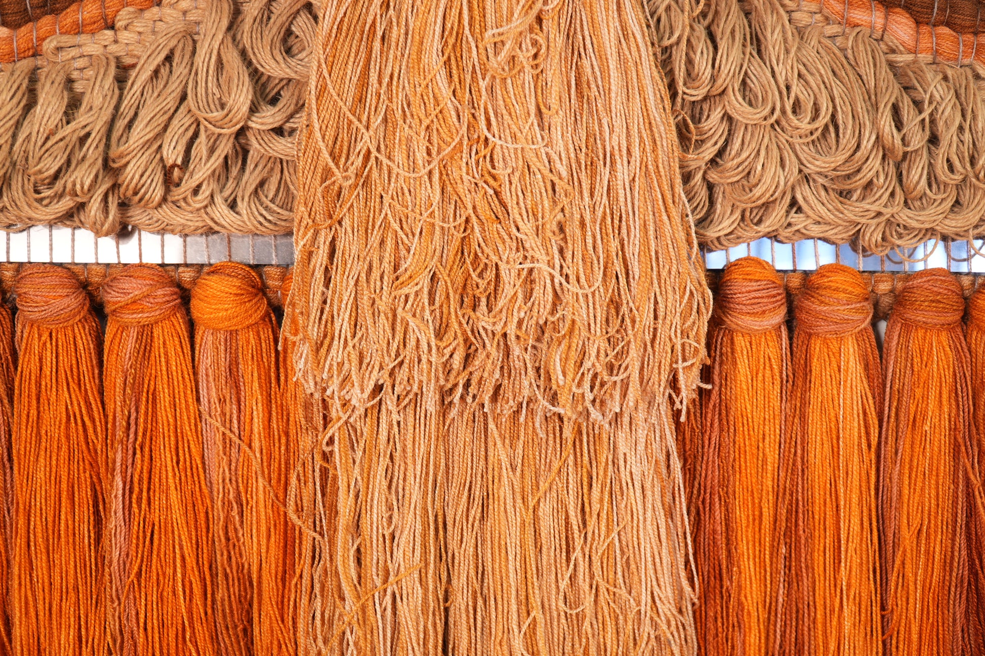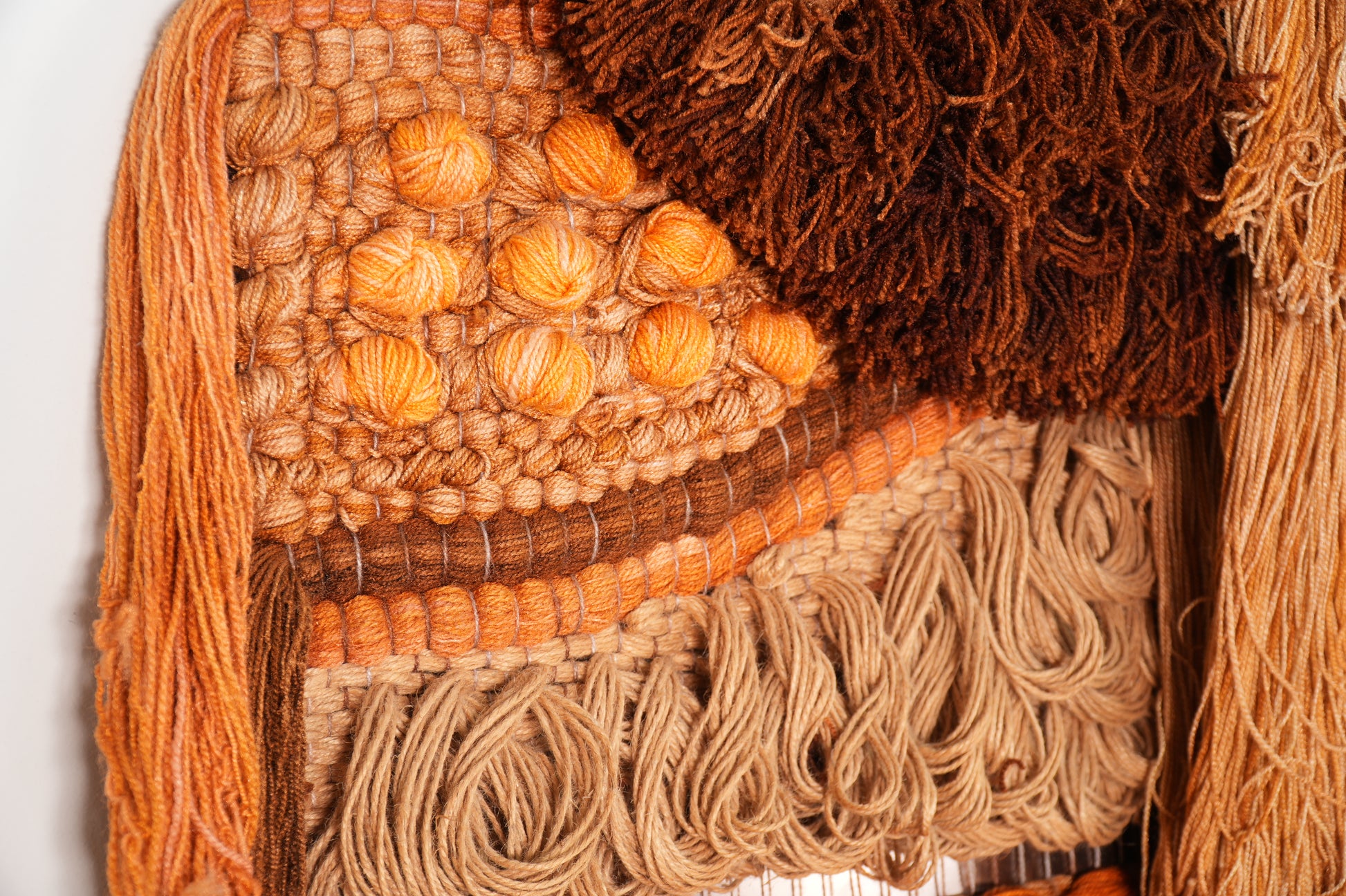 This is a striking mid-century modern textile piece crafted by Margo Farrin O’Connor in California in the 1970s and created for Ted Morris & Associates. This handwoven, hand-tied, & hand-dyed fiber tapestry features wool and jute in a rich palette of orange, brown, beige, rust, and ivory, characteristic of O’Connor’s monumental creations. 2-inch mirrored strips are incorporated into the piece's top and middle, extending from side to side and covering the wood battens. In very good original condition. Please see all images for complete condition information. Unsigned but distinctive work.
