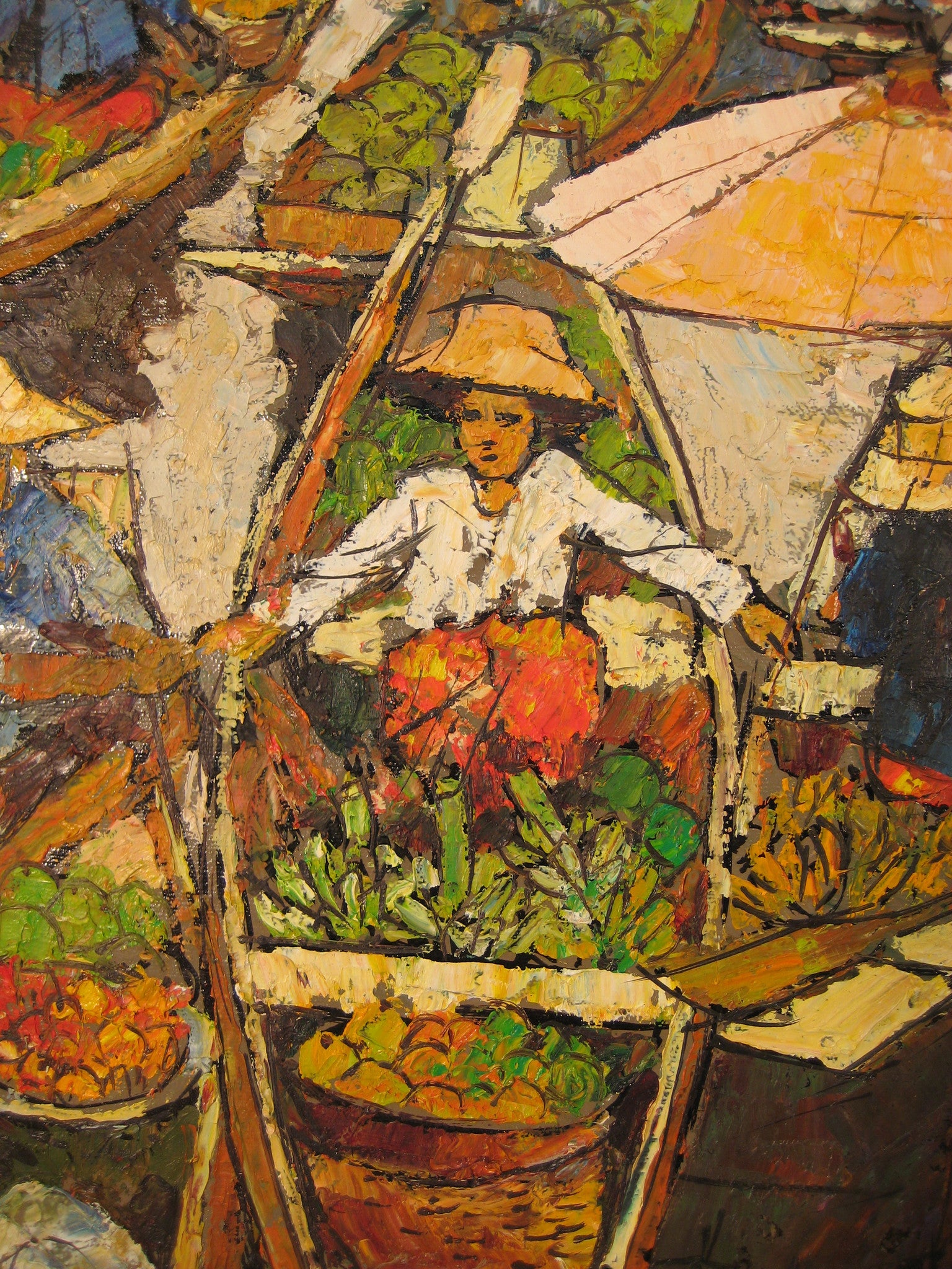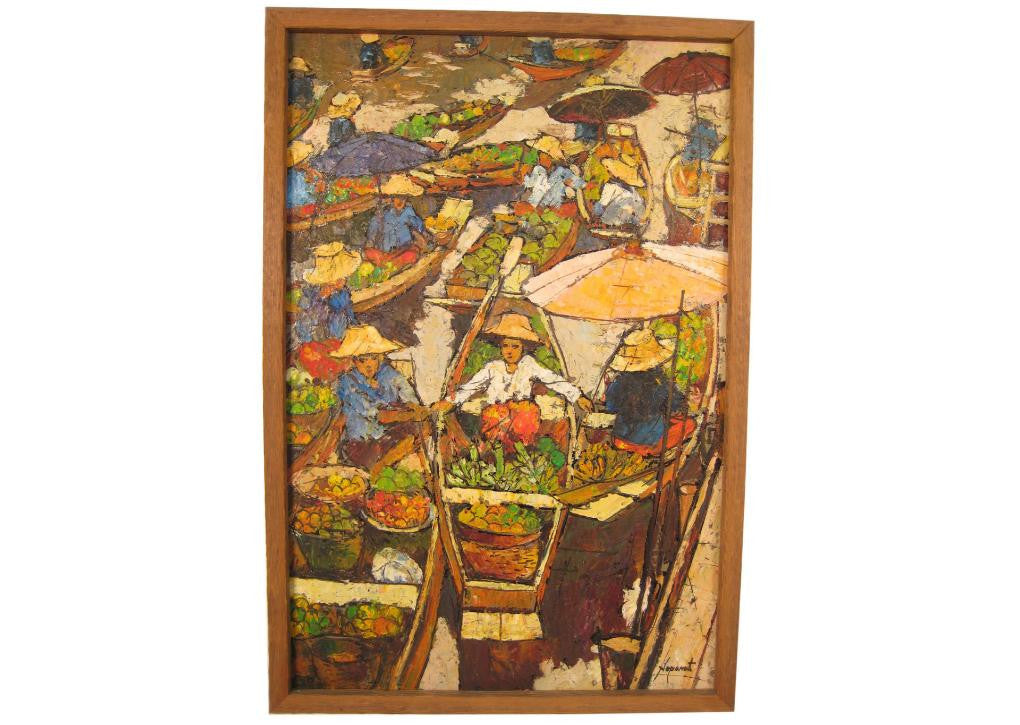 Small scale oil on canvas by Thai artist Noparat Livisiddhi. In excellent condition with great detail and wonderful texture. Signed lower right, Noparat. Overall dimension is 25" x 17". Noparat Livisiddhi was born in Roi Et province Thailand in 1932. Attended The Faculty of Painting and Sculpture from Silpakorn University for a year before he found a job as an illustrator for several leading newspapers and magazines from the 60’s to 70’s. Noparat has exhibited and received numerous awards from The National Art Prizes from 1953 – 1967. Noparat works are exhibited in both private collections and commercial spaces throughout the world and remain among the most collectable of all Thai artists.