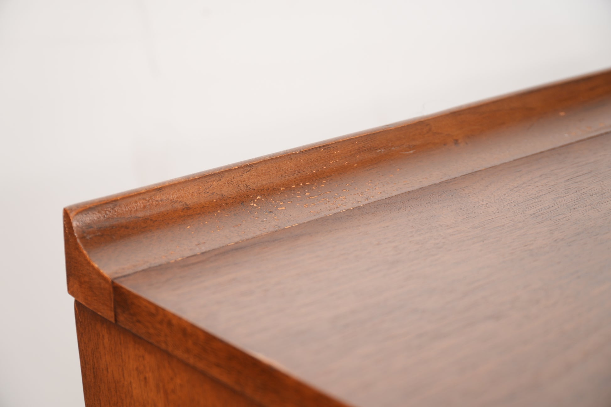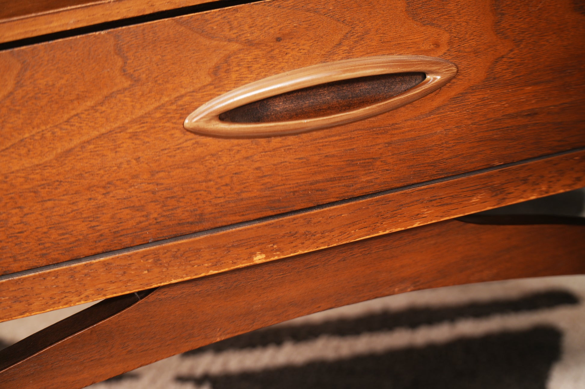Pair Broyhill nightstands from the Sculptra collection in excellent vintage condition. They feature a walnut finish, a single drawer on each with dovetail joinery, and are accented with almond-shaped pulls. Some finish missing in spots as seen in photos.