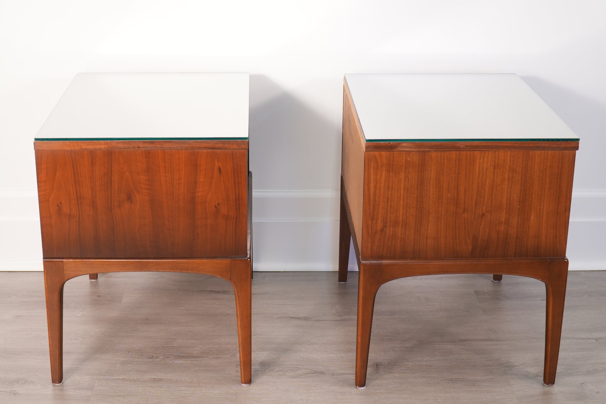 This is a pair of mid-century modern walnut nightstands made by the Lane Furniture Company of Altavista, Virginia. They are in very good vintage condition with some nicks and scratches, and some top surface wear. They do include cut glass pieces to protect the tabletops. Please see all images for complete condition information and inquire with any questions.