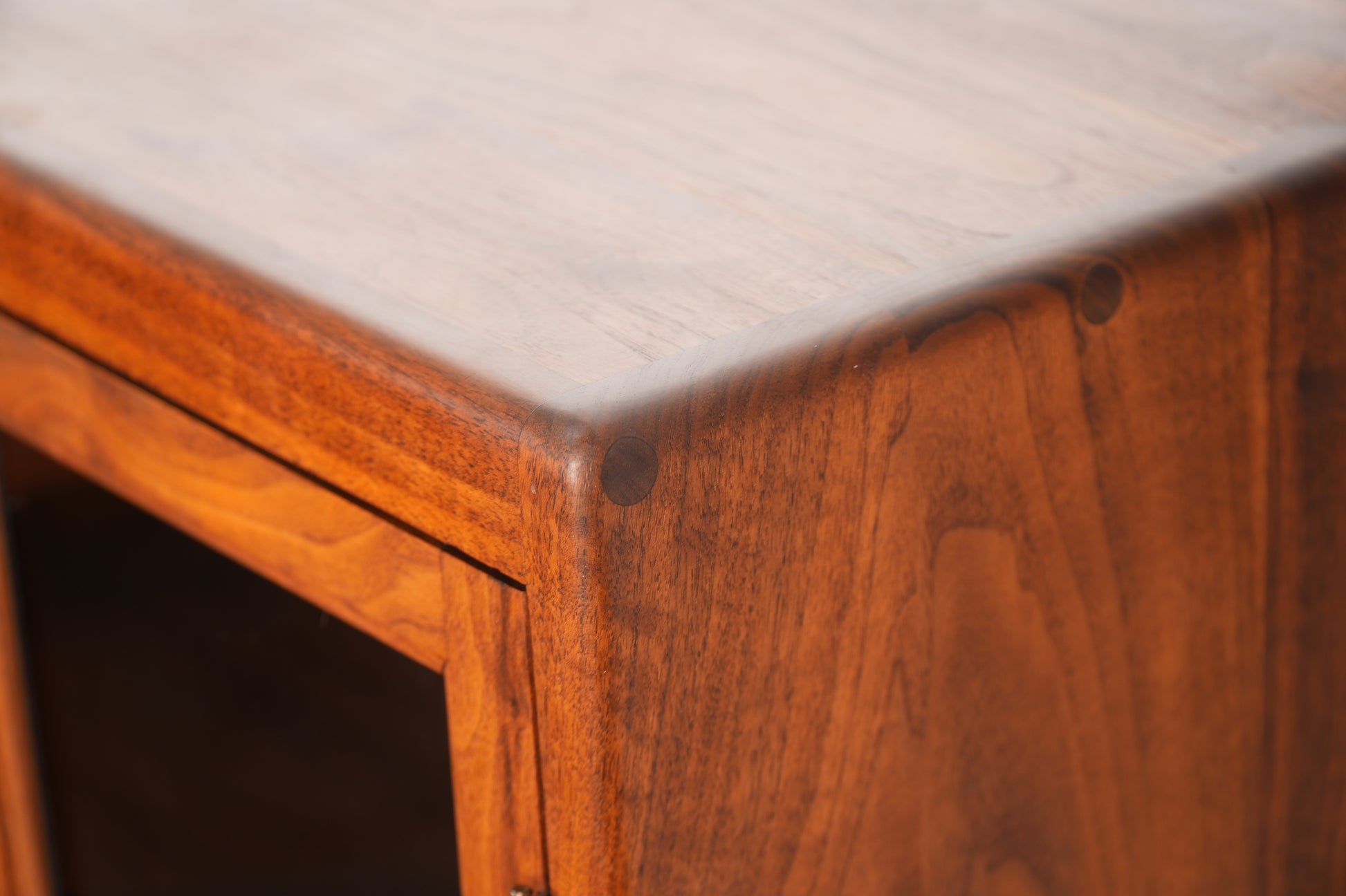 Handcrafted in beautifully grained solid walnut, this glass-front stereo component cabinet features two movable shelves and a fixed lower shelf with vinyl LP album storage below. Authentic Mid-century style with room for your vintage or contemporary stereo stack and enough lower storage space for 100+ pieces of vinyl w/ dividers. In excellent vintage condition and mounted on casters. Please view all images for more complete condition information.