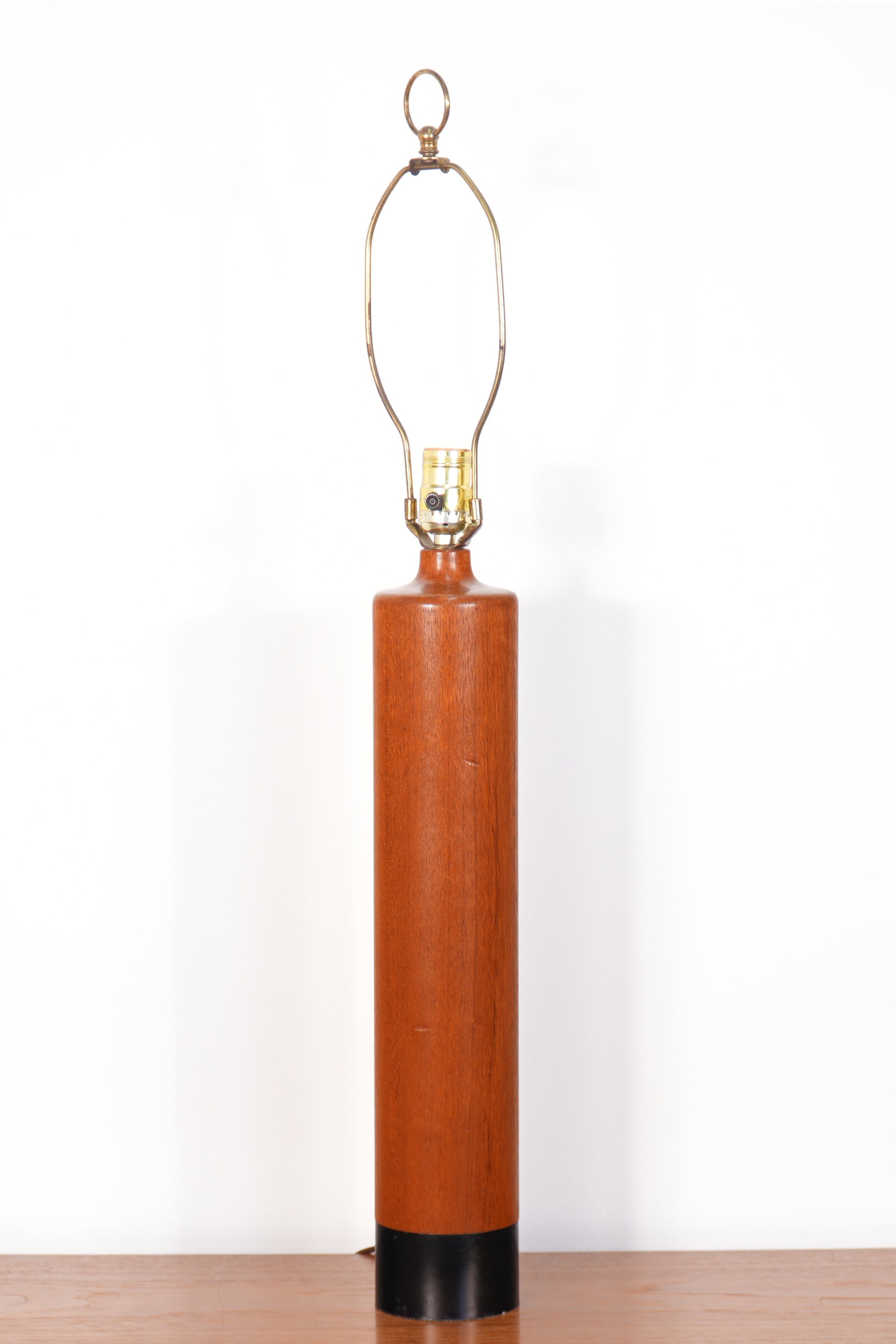 Handcrafted by ESA, this 1960s Danish lamp features a substantial, solid teak base paired with black leather wrap detailing. This lamp will bring curated character to any interior space. It appears to be in all-original working condition with the exception of the socket, which has been updated at some point. Even though this lamp lights properly, we recommend professional rewiring of all vintage lighting. Please view all images for more complete condition information and inquire with any questions.